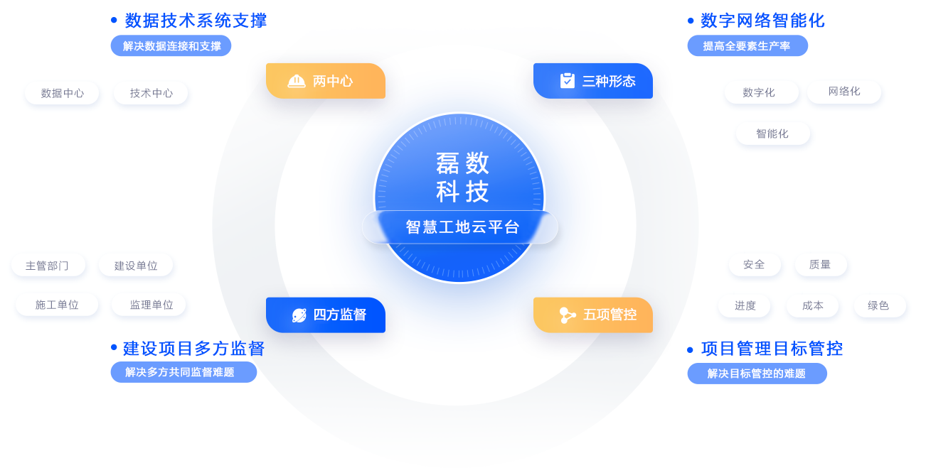 磊數科技智慧工地圍繞工地現場(chǎng)人、機、料、法、環(huán)五大生產(chǎn)要素, 綜合運用“BIM、AI、機器人、邊緣 計算、無(wú)人機、5G、XR、區塊鏈”等信息技術(shù),通過(guò)數字化、網(wǎng)絡(luò )化、智能化實(shí)現項目 全局優(yōu)化, 保障工程質(zhì)量、安全、進(jìn)度、成本等管理目標的順利實(shí)現,助力您的項目成為標桿。