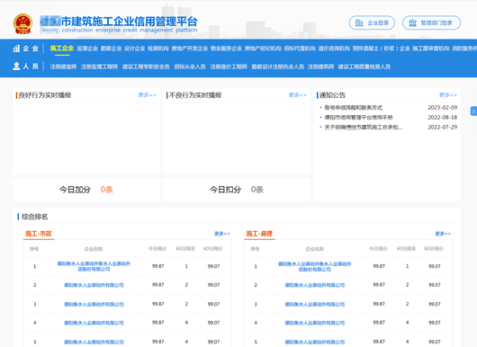 通過(guò)對企業(yè)的資質(zhì)證照、工程質(zhì)量、安全生產(chǎn)、文明施工、合同履約等方面的評估,對企業(yè)進(jìn)行信用評價(jià),形成信用等級,評價(jià)結果實(shí)時(shí)公示,供社會(huì )監督。
